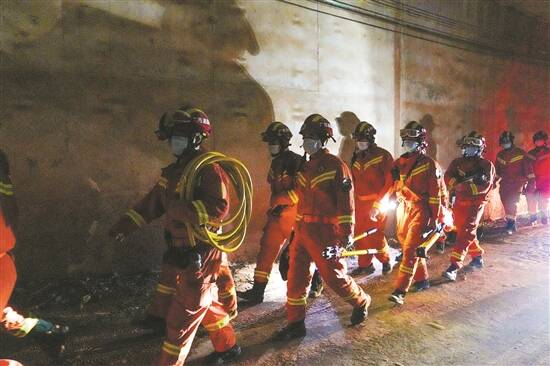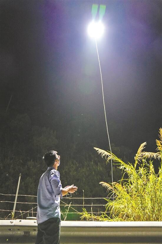 在毗邻事故现场的S40苍硕高速公路上,应急救援队伍使用无人机为现场救援提供照明 羊城晚报记者 梁喻 摄