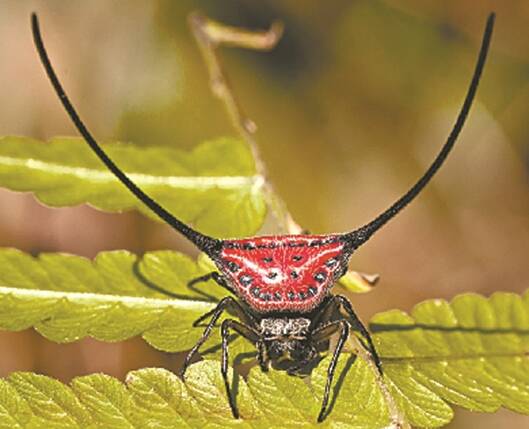 它可以说是结网蜘蛛中最具“明星脸”的蜘蛛了。它长着一对超级霸气的“角”——其实弓长棘蛛有三对倒棘,颜色均为黑色,其中第二对倒棘最长,这就是它霸气的“角”。这个“角”可能是其腹部长度的5.3倍。这个炫酷的长“角”的出现,很有可能就是为了装饰,但也有研究称,这个倒棘具有“卡脖子”的功能,也许是可以帮助弓长棘蛛抵御鸟儿的捕食。
