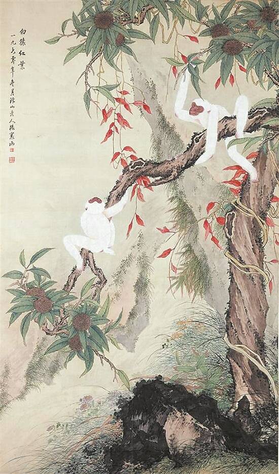 展览中的猿猴也有多件。古人认为,猿猴是具有“佛性”的,象征祥瑞吉祥,描绘者众多。本次展览中卢振寰的《白猿红叶》、程璋的《天都山猿图》、赵少昂的《月夜猿啼》等,同是画猿名家,不仅代表了不同的地域和风格取向,还是他们理论上或保守或创新的实践。