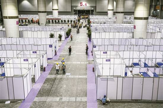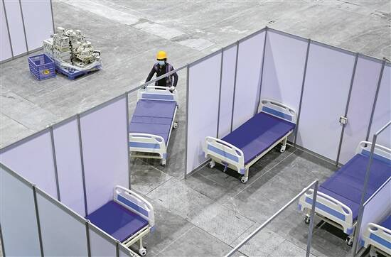 昨晚,位于广州琶洲会展中心的方舱医院正在紧锣密鼓施工中 羊城晚报记者 周巍 摄