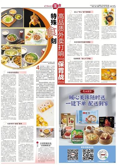 据了解,老字号广州酒家目前推出的外卖菜式接近7成是与线下实体店的菜品同步的。“外卖菜品与堂食菜品口味完全一致,都是广州酒家的大厨新鲜现做。”广州酒家相关负责人表示,用于线上平台的菜品会综合考虑较多的因素才会上线,包括菜品在打包后是否影响其品质、有汁的菜式在运输过程是否会容易碰损或泻漏等问题。接下来,广州酒家会陆续开发一些新的菜式,为顾客提供更多方便食用、快捷的餐食。