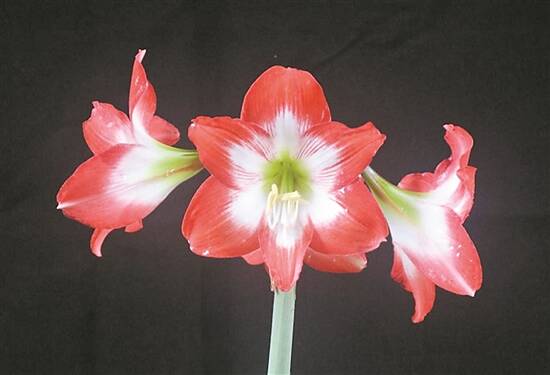 据介绍,“中科香妃朱顶红”和“华锦朱顶红”都是2010年以白肋朱顶红“H2”为母本,“花孔雀朱顶红”为父本进行杂交,经单株选择、组培快繁选育而成。多年多点试验结果表明,其遗传性状稳定一致。在简易设施栽培条件下自然花期3-4个月,单朵花寿命7.0天,单葶花观赏期14.0天。“中科香妃朱顶红”属复色系朱顶红新品种,与对照品种“舞后朱顶红”相比,花茎高度增加10.0%,花朵更大、直径增加10.7%,花有香味,花色淡雅。“华锦朱顶红”在简易设施栽培条件下自然花期3-4个月,单朵花寿命6.5天,单葶花观赏期12.5天。“华锦朱顶红”属复色系朱顶红新品种。与对照品种“花孔雀朱顶红”相比,花茎直径增加11.5%,花朵更大、直径增加12.5%,花筒长增加12.8%,花色更鲜艳。