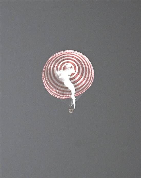 红白相间的主降落伞吊挂着返回舱徐徐降落
