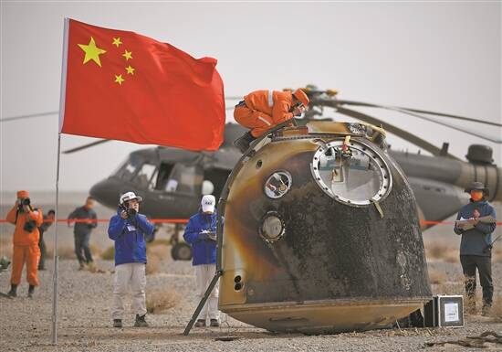 16日,神舟十三号载人飞船返回舱在东风着陆场预定区域成功着陆