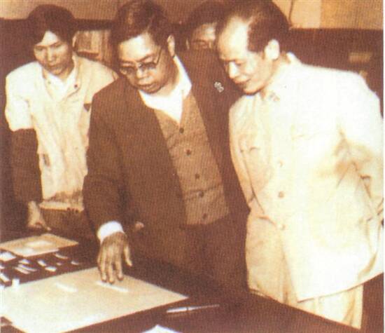 1986年3月,时任中共广东省委副书记谢非(右)视察羊城晚报时与关国栋合影