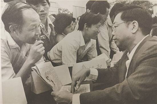 1988年,关国栋(右)在羊城晚报“读者活动日”现场与读者交流