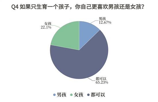 如果只生育一个孩子,65.23%的大学生表示“没有性别偏好”,而其余的大学生,偏好女孩的占比则更高。