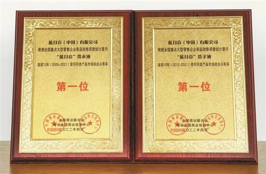4月22日,在中国商业联合会和中华全国商业信息中心联合公布的2021年度市场销售领先品牌中,蓝月亮洗衣液连续13年(2009—2021)荣列同类产品市场综合占有率第一位,蓝月亮洗手液连续10年(2012—2021)荣列同类产品市场综合占有率第一位。
