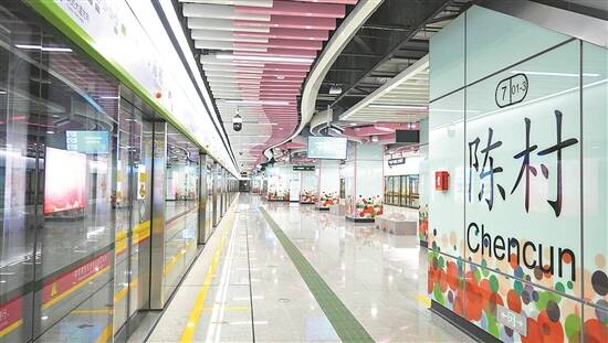广州地铁7号线西延顺德段的8座车站中,北滘公园、陈村两座车站为特色景点站,以岭南水乡的地域文化为主题进行特色装修。记者在北滘公园站出入口看到,出入口飞顶与既有广佛线的设计不太一样,虽然都是采用红色玻璃盒子和剪纸风格,但该站的整体外形设计采用龙舟原型元素,像一条飘舞的红丝带。在陈村站,记者看到,站内融合了兰花和三字经的元素,通过把兰花柔美的曲线和三字经文字运用到公共空间设计中,既有历史文化内容又有时代生活气息。