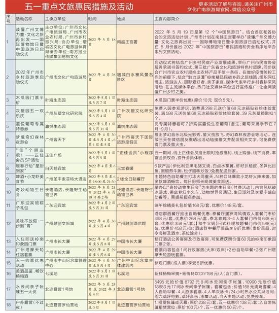 其间,花都区将推出“惠民旅游护照”,联动区属30个景区(景点)推出免票、半票、特惠票等系列优惠措施,并鼓励景区、酒店、民宿推出住宿联游套票。广州莲花山景区、南沙水鸟世界生态园、南沙湿地景区、七彩澳游景区等网红景区,将针对五一假期推出形式各异的惠民“红利”,为市民游客献上优惠“大礼包”。