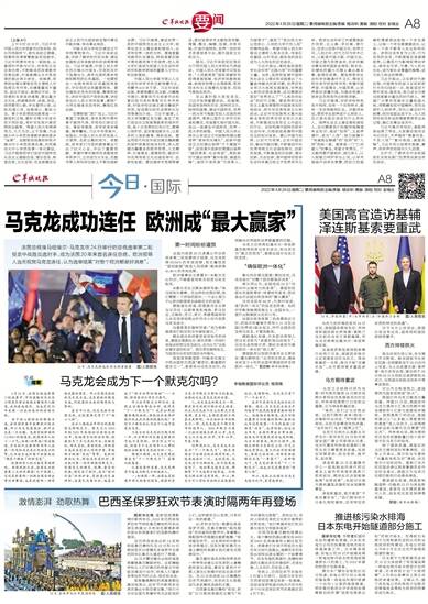 乌克兰总统弗拉基米尔·泽连斯基在推特祝贺马克龙连任,称马克龙为“真正的朋友”,感谢法国对乌克兰的支持。