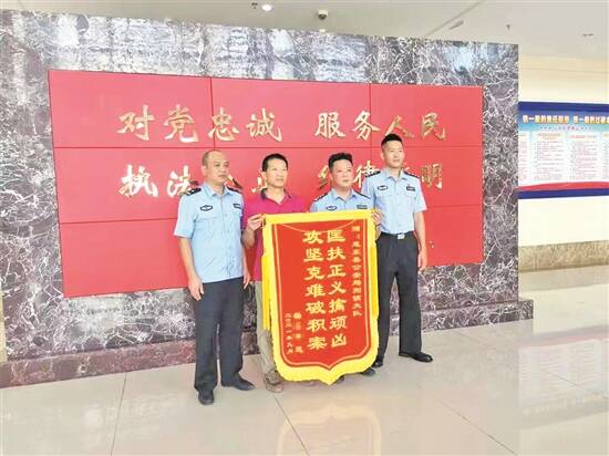 案件告破后,事主杨先生向警方送上锦旗感谢 图/广东省公安厅