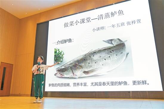 广东实验中学荔湾学校第一小学部的学生向同学们展示自己在家中做清蒸鲈鱼的过程