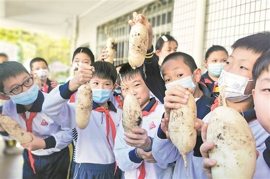 越秀区中星小学的学生收获自己栽种的萝卜,这些萝卜给他们拿回家做菜 杨昕 摄