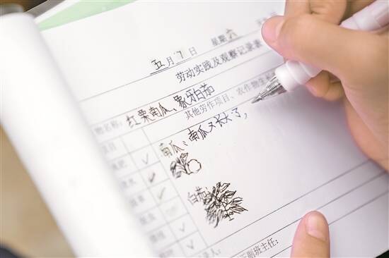 早读前,五年级学生姜蕴恩和她的小伙伴们来到“天空农场”,这里设有叶菜种植区、瓜果种植区和中草药种植区,她们班负责的,是一排红栗南瓜和象牙白茄。浇水、除草、做记录……长了多少片叶子、开了多少朵花朵,植物高度如何、长势怎样,姜蕴恩在本子上将情况细细地记录下来,甚至还画下了植物的样子。