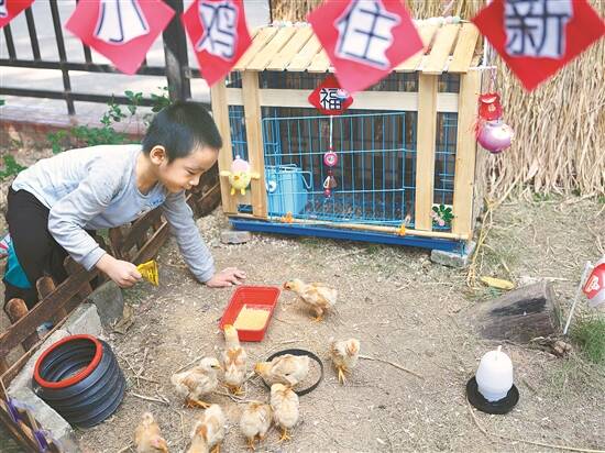 小朋友在幼儿园饲养小鸡