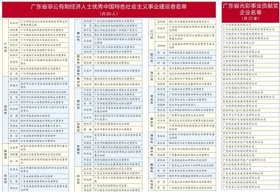 为表彰先进、树立典型,进一步激励我省广大非公有制经济人士和新的社会阶层人士坚定理想信念、坚持高质量发展、自觉诚信守法、积极承担社会责任,省委、省政府决定,授予刘水河等89名非公有制经济人士和新的社会阶层人士“广东省非公有制经济人士优秀中国特色社会主义事业建设者”荣誉称号,授予广州华新集团有限公司等37家企业“广东省光彩事业贡献奖”。希望受表彰的非公有制经济人士和新的社会阶层人士以及民营企业的优秀代表珍惜荣誉、戒骄戒躁,进一步弘扬爱国、敬业、创新、守法、诚信、贡献的优秀建设者精神和义利兼顾、以义为先、自强不息、止于至善的光彩精神,扛起新时代赋予的重任,积极进取、再创新绩,发挥好模范带头作用,在推动高质量发展中勇立潮头、展现新担当新作为。