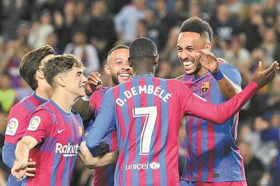 巴塞罗那队球员奥巴梅杨(右一)在进球后与队友庆祝 新华社发