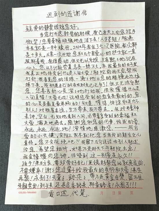 2020年12月底,霞姨转院了。“很想知道阿姨的情况,但我也不敢问。”梁静雯说,直到霞姨的先生将这封“迟到的感谢信”送到她手中,才知道,转院后的几天霞姨就告别了人世。离世前,特意口述了这封感谢信。“转院前两天,您帮我打针,我看见您的泪珠一滴滴地从您的眼镜片边缘掉下来,我知道自己在世的时光已无多了!但又无法安慰您,您善良的心灵深深地打动我……估不到,这一别竟是永久!”霞姨满纸感激之情。