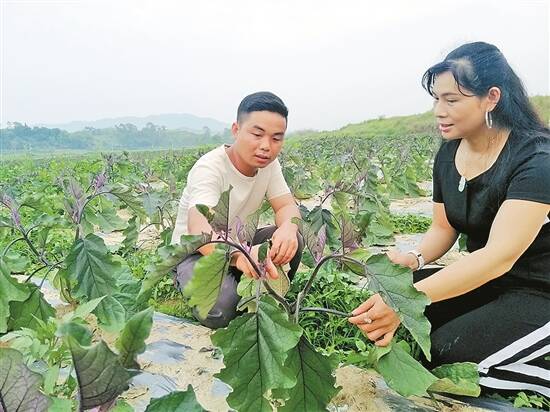 基地管理人员梁杰强(左)向客商介绍茄子生长情况
