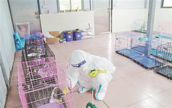 添粮、加水、铲屎,检查每只宠物的基本情况,再用酒精喷洒环境做好消毒。5月3日以来,每天早晚,瑞派宠物医院的工作人员小旦都会身穿防护服,走进宠物临时安置点,为宠物提供悉心照料。