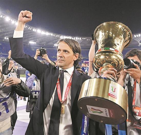 国米主教练因扎吉手举奖杯庆祝 新华社发