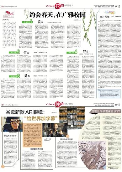 几场春雨过后,一切都明媚、晴朗起来。不仅是紫荆,木棉不知何时已欣然傲立枝头;不久前还光秃秃的大榕树也绽开了如花骨朵儿般的新芽;还有风铃木带着一身耀眼的嫩黄在春风中飞舞起来;泥地里长出了一株株小野花,虽然并不引人注目,却一样开得娇嫩又坚韧……我的校园——雅园便裹在这样一片五彩生机中。