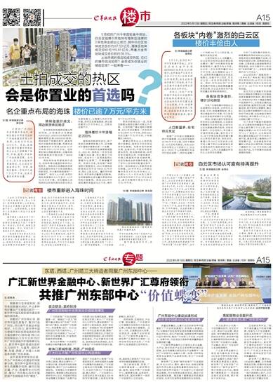例如,空港大道中东侧地块所在的白云新城板块,以总部经济集聚区为目标打造,已成为白云区发展最成熟的板块,该板块在售的一手住宅较少,有主推大平层的西派云峰,单价约8万元,这个价格与其周边的富力富云山吹风价差不多,而在近日,粤海以约102亿元在去年土拍市场上拿下的白云新城商住混合体地块所打造的项目开设了临时展厅,工作人员透露的吹风价比上述项目还要高。