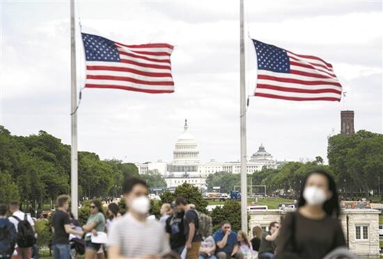 5月12日,在美国华盛顿,华盛顿纪念碑周围的美国国旗降半旗悼念新冠逝者 新华社 发