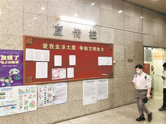 5月13日下午2时30分,记者来到金泽大厦,进门的保安要求过往人员出示健康码。进入大堂,左侧墙壁的宣传栏上贴着各种政府部门通知和疫情防控相关文件、海报,右侧的角落边有一个不锈钢制成的“业主意见箱”。记者走访中还发现,这里楼上楼下租户不少,人员进出频率比较高。