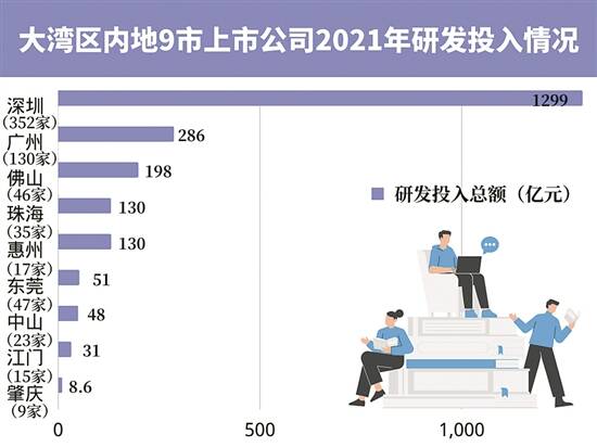 羊城晚报记者根据同花顺梳理发现,目前,来自大湾区内地9市A股上市公司的共有710家,占到了广东上市公司的九成。其中公布了2021年研发投入额的共有674家,其研发投入总额达2183亿元,占广东A股上市公司当年研发投入经费总额的96%。