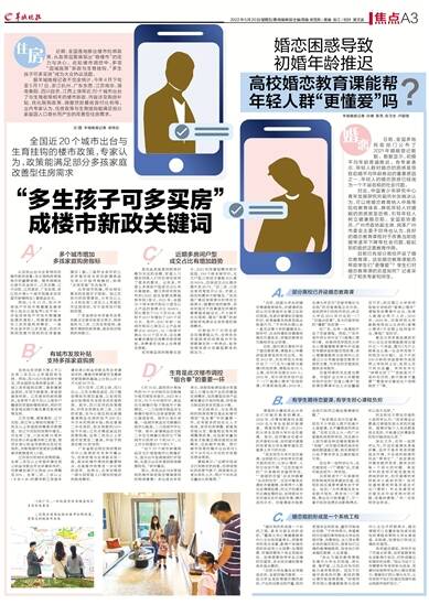 “目前大学生基本没有接受系统、全面的婚恋教育。一些大学生受到情感问题的困扰,产生的后果也较严重,轻则荒废学业和前途,重则可能违法犯罪。”于欣伟表示,希望高校开设婚恋课传授给大学生选择对象、夫妻相处、生儿育女等系统的婚恋知识,培育他们正确的爱情婚姻观,促进他们将来婚恋美满、人生幸福。