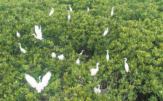与海陵岛隔海相望,在阳东区寿长河红树林国家湿地公园内,有成群结队的白鹭到此栖息,它们或展翅嬉戏,或低头觅食,成为当地一道最靓丽的风景线,凸显出阳江市生态环境不断优化的成效。