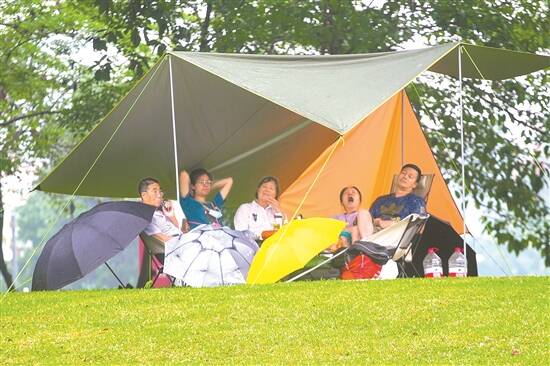 21日,广州露营市民在帐篷内避雨 梁怿韬 摄