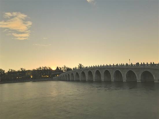 于是,黄昏入园,急行至十七孔桥边候月,但东边天际有朦胧雾气,又有霓虹闪烁,令人担忧。直至八时十分,暗红的月亮方从林木间露出脸膛。东边天际依然晦暗模糊,虽费尽心机,也未拍得一张满意的照片,此时看园人厉声催促离园,只好怏怏而退。