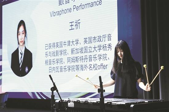 辰美学子在美育论坛上进行马林巴表演