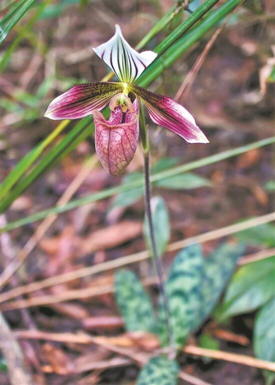 在此次野外调查中,研究团队还获得意外惊喜,在自然保护区海拔700多米山腰的丛林中发现了国家一级保护野生植物紫纹兜兰。穿山甲和紫纹兜兰的发现,证明了保护区的生态正在不断向好发展。
