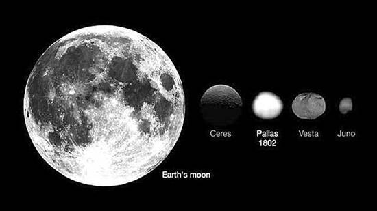上图从左至右依次为月球、1号谷神星、2号智神星、4号灶神星、3号婚神星,由此可大致判断它们的体积比例 (资料图片)