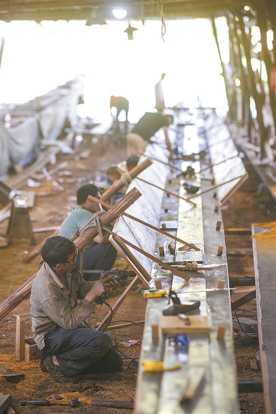 黄剑挺和七名工人搭档多年、配合默契,没有图纸,也能造出符合客户要求的龙舟。其中,最资深的师傅63岁,做了一辈子龙舟;最年轻的师傅36岁,入行也有十来年。