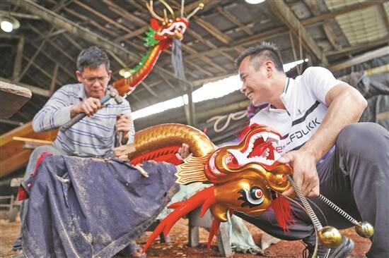 黄剑挺主要负责为新龙舟复刻船身,负责龙头龙尾制作的,则是黄埔区非遗项目“龙舟龙头、龙尾制作技艺”代表性传承人、“85后”小伙张伟潮。北京冬奥会开幕式上,二十四节气倒计时开场中芒种时节片段里,那只破水而出、极具岭南特色的龙头,正是出自张伟潮之手。