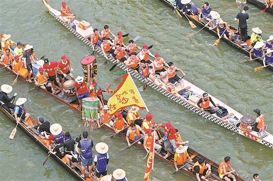 端午节假期,广东省内许多地方都会举办龙舟竞渡。其中,佛山叠滘的龙舟以弯道漂移闻名、广州车陂有十里八乡相聚的龙舟“车陂景”、阳江江城有“逆水行舟”赛、顺德黄连有“龙虱”个人赛、饶平所城有陆地“游旱龙”。地理位置和文化习俗存在差异,使不同地方龙舟竞赛方式各有千秋,构成了独具一番特色的龙舟竞渡景观。