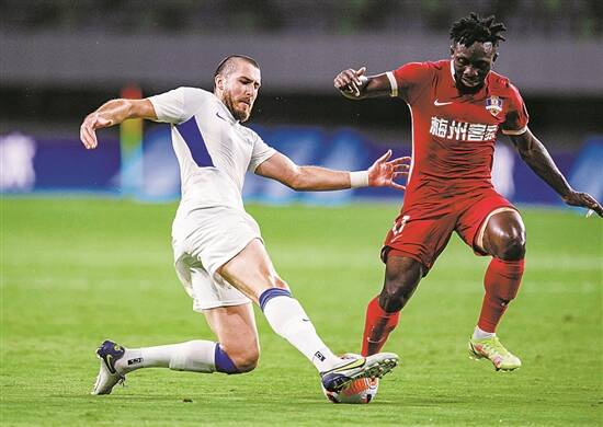 梅州客家队球员吉森(右)与天津津门虎队球员安杜哈尔拼抢 新华社发