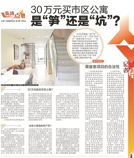上期有市民报料称广州市内存在总价约30万元的公寓,记者走访发现,这些项目其实是使用权公寓,“买家”签订的是租赁合同,无个人产权(详见5月31日A14)。报道发出后,有市民报料,中介在宣传这类公寓项目时常以有“红本”作为噱头。既然无个人产权,那所谓“红本”究竟是什么?来看本期羊城晚报记者追踪报道。