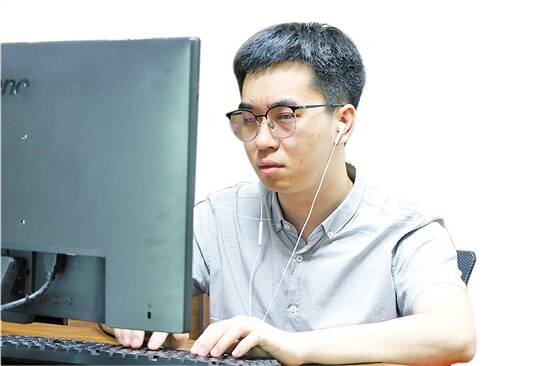 蔡勇斌创办的东莞市一同信息科技有限公司设在樟木头镇。戴着眼镜的他,面目清秀,端坐在电脑前,双手飞快地敲击着键盘,调试代码。如果不说,很难看出他是一位盲人程序员。