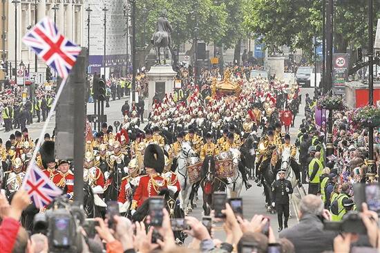 6月5日,人们在英国伦敦观看花车游行 新华社发