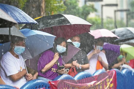 家长雨中接考 羊城晚报记者 梁喻 摄