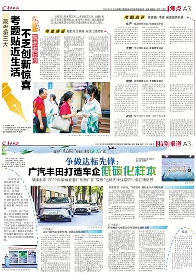 铁一中学黄俊霖同学说,地理考卷以“神舟十三号载人飞船于2021年10月16日从酒泉卫星发射中心发射升空,2022年4月16日飞船返回舱成功着陆”为背景,要求求出这段时间广州塔与酒泉卫星发射塔之间的正午太阳高度差。他表示,这样贴近时事热点内容的题目让他眼前一亮,尽管计算时遇到了麻烦,但基础牢固的话还是可以计算出来的。“此外,碳排放这一常见话题,则在选考题中结合了快递运输来考,问我们应该以什么方式促进碳减排,非常贴近我们的生活。”