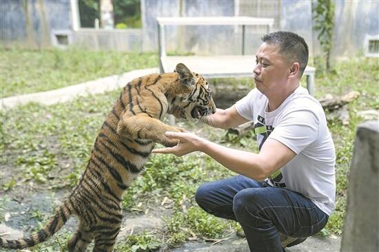 说到与华南虎相处印象最深刻的事时,雷胜桥说最难忘的是“王子”和“公主”的第一胎虎宝宝“威威”得了肺炎。当时,得了肺炎的“威威”已经动不了,只有腹部还微弱地上下起伏,把雷胜桥急坏了。他连忙向上级报告,请来了专家为“威威”诊治。在当时,感染肺炎对幼虎来说几乎是致命的。“这只老虎是我花费精力最多的,也是我照顾最久的,当时我连续一个月都没有回家,连续三四天没有合眼。”所幸在专家精心诊疗和雷胜桥的悉心照料下,“威威”挺了过来,成长为一只威风凛凛的百兽之王。