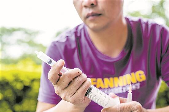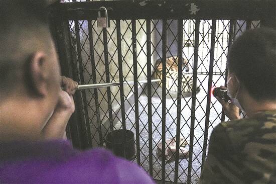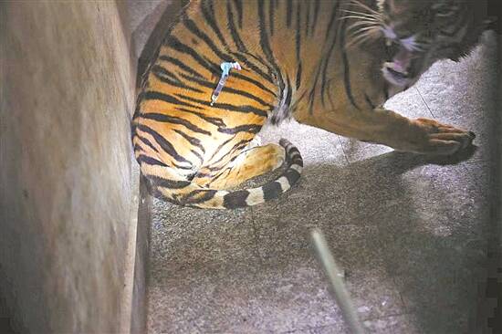 雷胜桥给老虎“吹针”,将配好药水的注射器塞进特制的金属管里,隔着房门人工吹到老虎身上,针头刺入老虎肌肉即自动注射药物