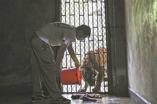经过一段时间的学习和探索,雷胜桥慢慢掌握和熟悉了华南虎的饲养要领。例如制定食谱:成年华南虎日食一餐,食量按体重的7%-8%分配,每周二和周五严格控制食量,以维持成年虎身材比例,保持身体健康;幼年华南虎日食2-3餐,具体根据观察了解每只小老虎的牙口、消化能力进行调节,以保证充足的营养。